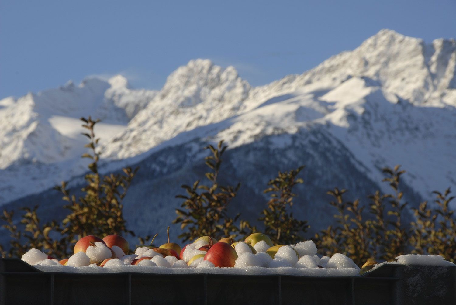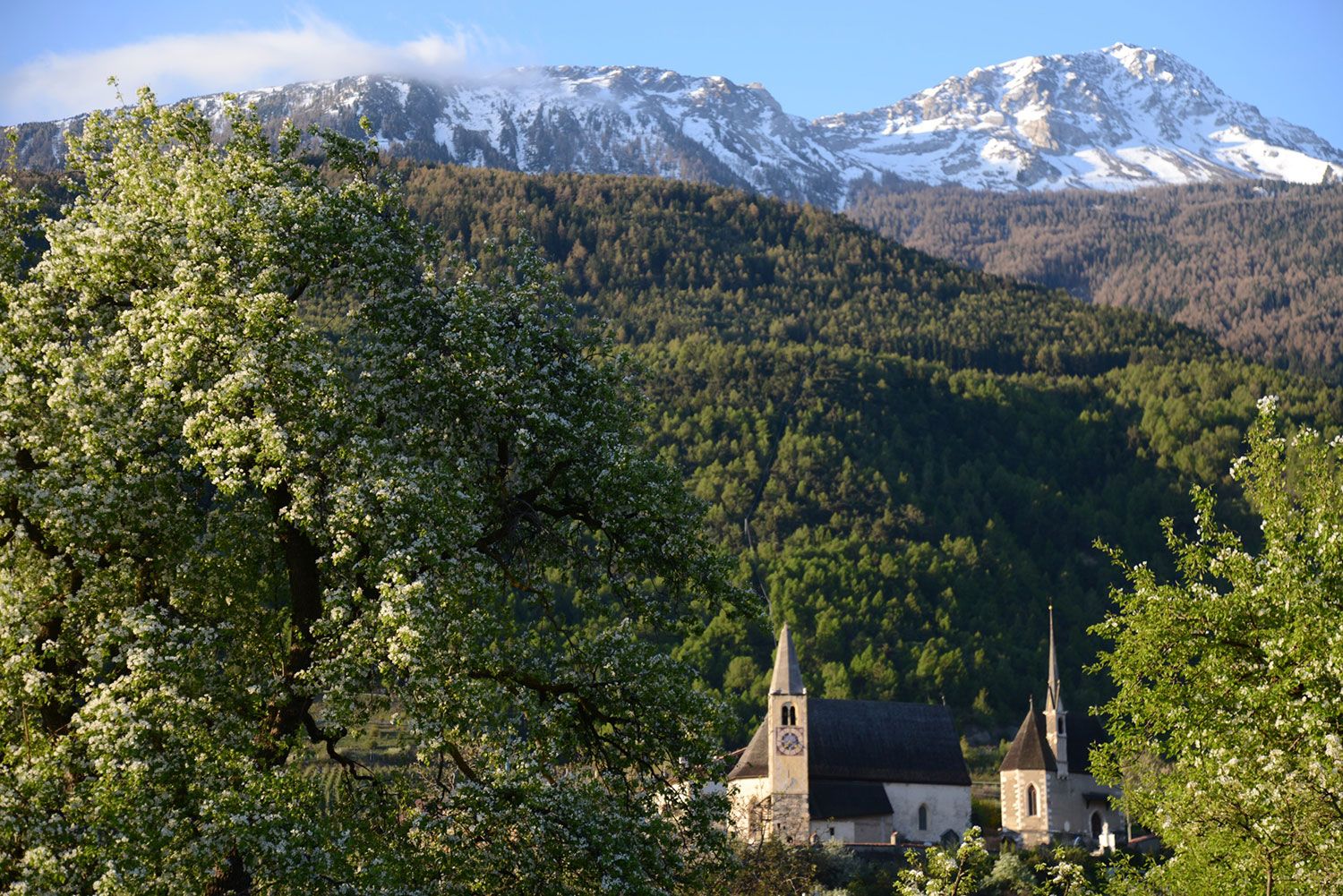 Weiße Berggipfel, strahlend blauer Himmel und zu ihren Füßen ein Tal mit Millionen von Apfelblüten. Dies ist ihr Frühlingsbeginn am Sonnwarthof.